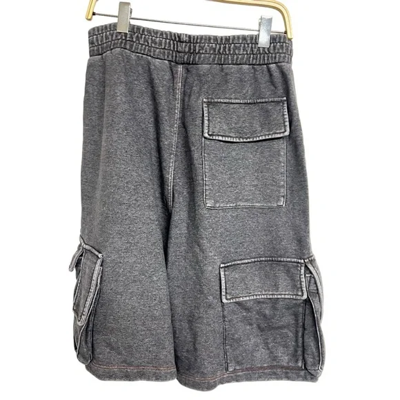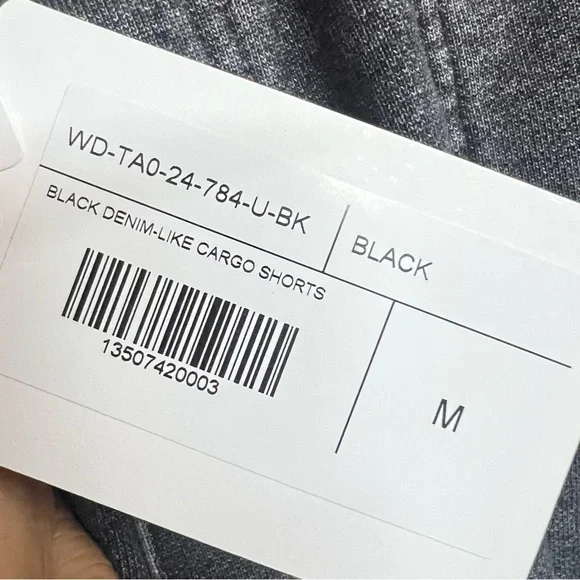 New with tags.Size medium.Washed denim-like cargo shorts in black with multi pocket detailing- Elasticized waistband- Slash pockets at side seam- Cargo pockets throughout- Logo embroidered at pocket flap- Fading throughout- Cotton 100%- Dry Cleaning